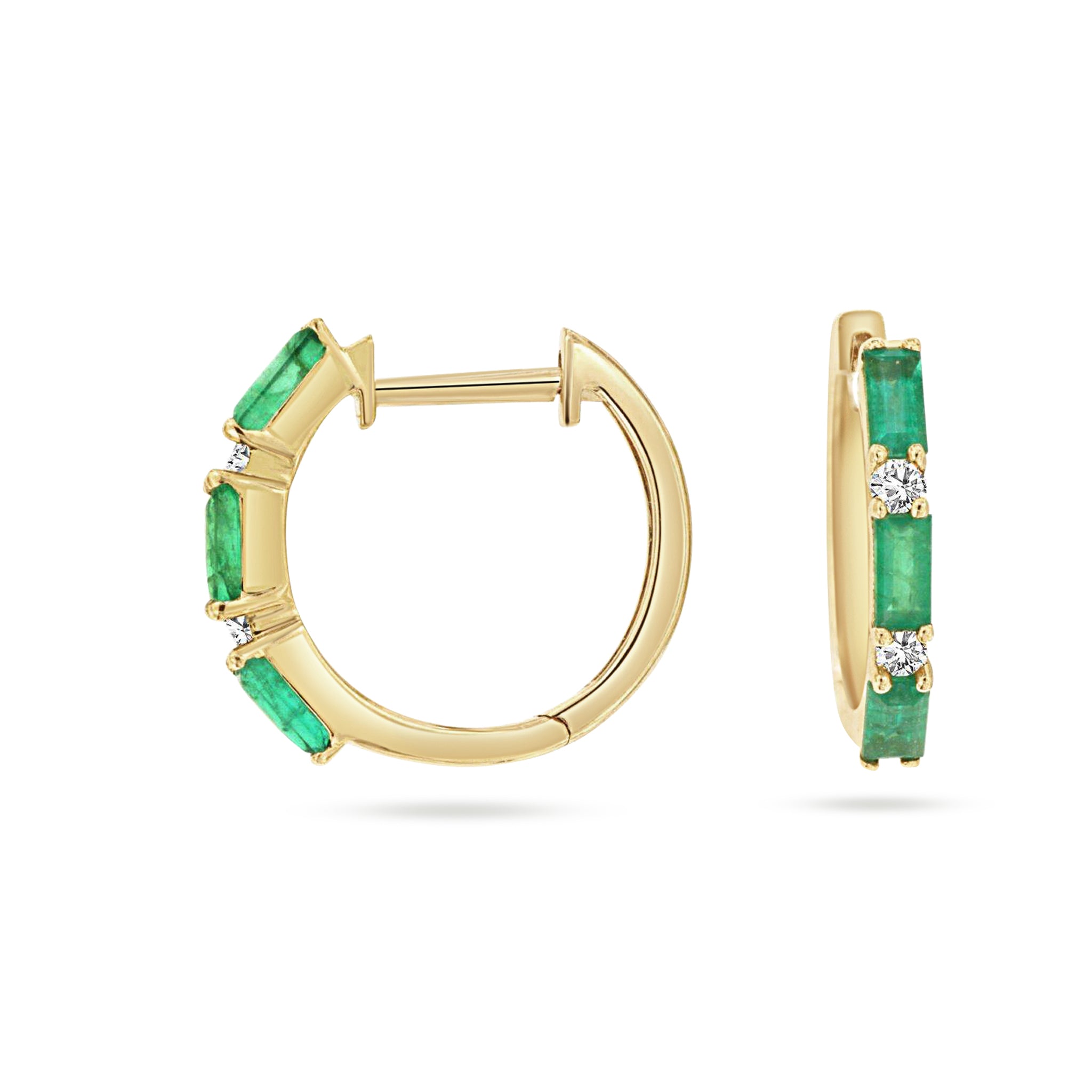 14K Yellow Gold Baguette Cut Emerald and Diamond Huggie Earrings
