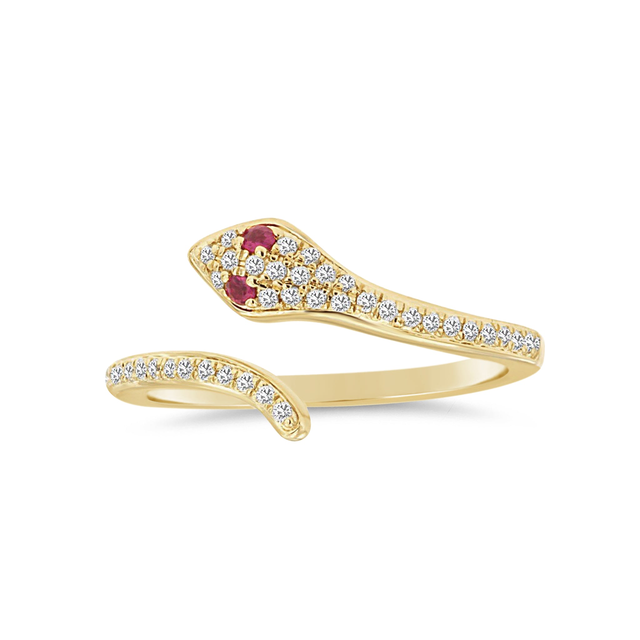 14K Yellow Gold Pave Diamond Snake Ring with Ruby Eyes
